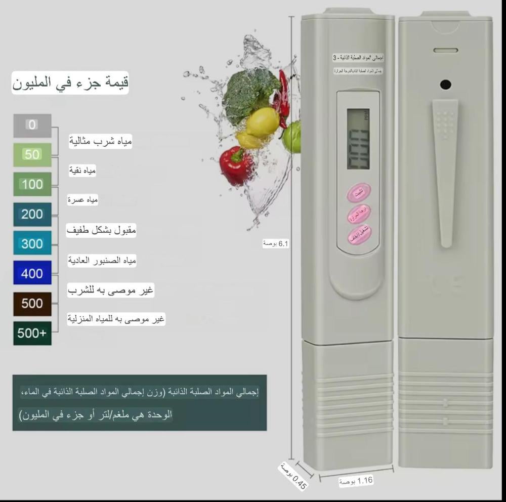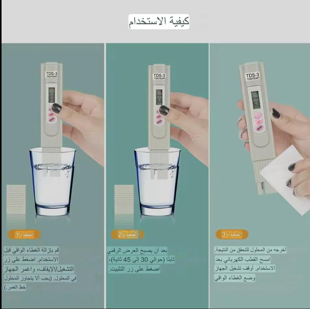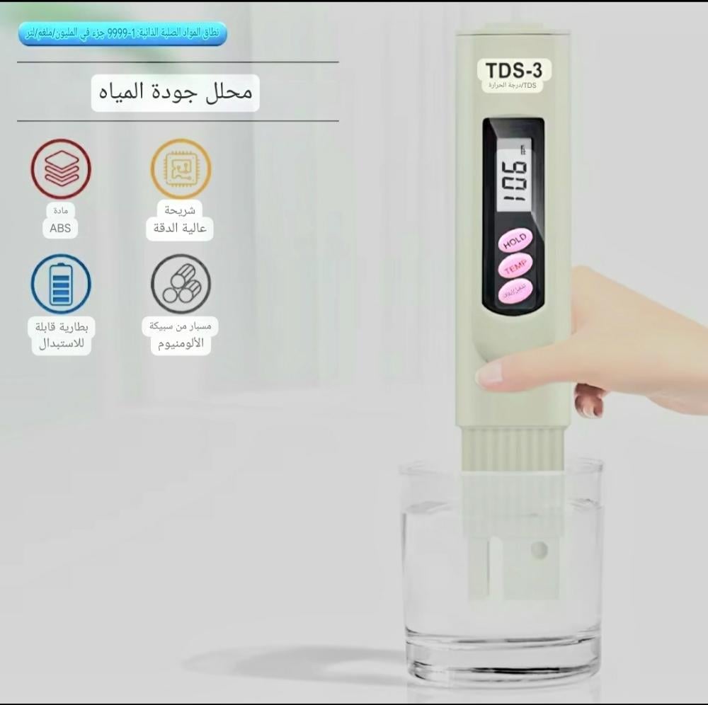 جهاز إلكتروني عملي لفحص جودة المياه، يقيس نسبة المواد الصلبة الذائبة (TDS) والتي تشمل الأملاح، وكذلك درجة حرارة الماء. مثالي لماء الشرب، الخزانات، فلاتر التنقية، الأحواض، الزراعة، وأكثر!